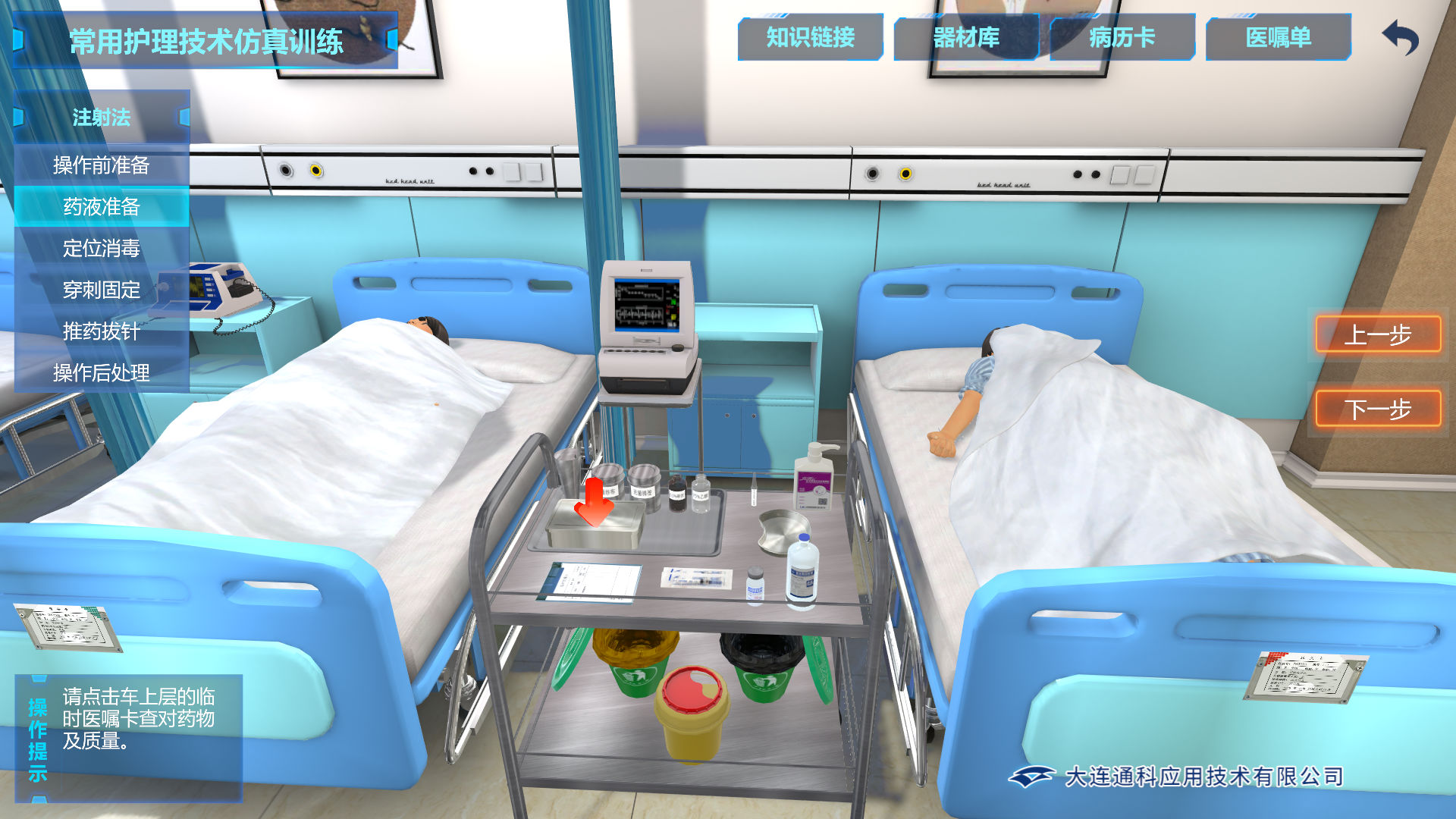 與教育部有關(guān)專業(yè)課程教學(xué)大綱而設(shè)計,包括靜脈輸液法、灌腸法、洗胃法、鼻飼法、注射法、藥敏試驗法、導(dǎo)尿術(shù)、吸痰法等10個護(hù)理實訓(xùn)單元,實訓(xùn)項目10余個。每個實訓(xùn)項目根據(jù)需要設(shè)計了若干個實訓(xùn)任務(wù)。例如,注射法包括皮內(nèi)注射法、皮下注射法、肌內(nèi)注射法、靜脈注射法4個實訓(xùn)項目,每個實訓(xùn)項目中設(shè)置了操作前準(zhǔn)備、準(zhǔn)備藥液、定位消毒、穿刺固定、推藥拔針、操作后處理這樣的實訓(xùn)任務(wù)。軟件以技能為核心,項目為引領(lǐng),任務(wù)