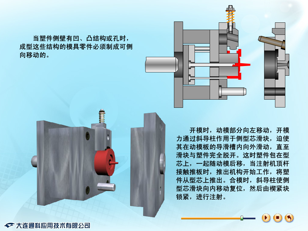 1.動作原理:U形件彎曲模、V形件彎曲模、電極板沖孔模、導(dǎo)柱沖裁模、倒裝復(fù)合模、復(fù)合沖裁模、筒首次拉伸模、側(cè)刃定位沖裁模、斜導(dǎo)柱側(cè)向抽芯注射模、斜滑塊側(cè)向分型與抽芯注射模、擺鉤雙分型面注射模、彈簧拉桿雙分注射模、定距導(dǎo)柱雙分注射模、單分型面注射模、雙分型面注射模驟。